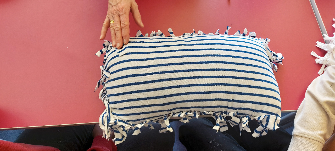Etape 3: Nouer les lanières des deux carrés sur les 4 côtés du coussin (voir photo)